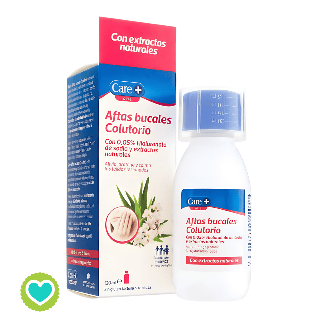 Care+ colutorio Para Aftas Bucales 120ml para las heridas de la boca. Las aftas y las heridas bucales pueden aparecer por múltiples razones, como el roce de una ortodoncia, una mordedura, una mala alimentación o una bajada de defensas por enfermedad. Para aliviar el dolor que provocan estas pequeñas pero molestas heridas, Care+ ha desarrollado este spray con hialuronato de sodio y 9 ingredientes naturales. Gracias a esta composición alivia el dolor de forma inmediata y duradera, y favorece la cicatrización. Su aplicador facilita su uso en cualquier parte de la boca.