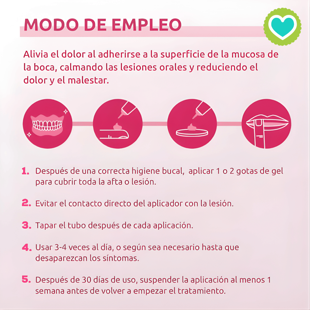 - Después de una correcta higiene bucal, aplicar 1 o 2 gotas de gel para cubrir toda la afta o lesión.
