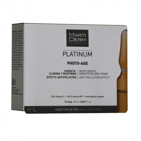 Photo Age Martiderm es un tratamiento de Martiderm para prevenir las arrugas del cuello y la cara así como la flacidez y otros signos del fotoenvejecimiento cutáneo prematuro que se han producido por el estrés oxidativo de la piel así como por la exposición solar. Corrige paulatinamente las arrugas gracias al poder reparador del proteoglicano. Martiderm Ampollas tiene efecto inmediato aportando tesura y luminosidad y a largo plazo, reafirmando e hidratando la piel.