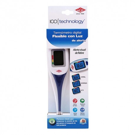 Termómetro con luz para una respuesta precisa de la temperatura corporal.ICO Termómetro Digital Flexible con Luz es capaz de comprobar la temperatura corporal de una manera rápida y eficaz. Es de fácil lectura y tiene una memoria con la que se pueden ver las últimas mediciones acumuladas.