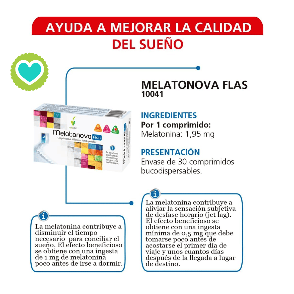 Novadiet Melatonova Flas 30 comprimidos es un suplemento natural a base de melatonina que contribuye a disminuir el tiempo necesario para conciliar el sueño y aumenta la calidad del mismo. Posee la capacidad de ayudar a calmar el nerviosismo y el estrés, coadyuva a aliviar el dolor de cabeza y el dolor muscular. Es un producto inocuo, no tóxico, por lo que no produce ningún efecto secundario que pudiera ser nocivo para la salud.