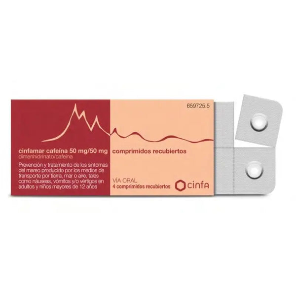 Medicamento dedicado a eliminar los mareos causados por los medios de locomoción. Con dimenhidrinato y cafeína.Cinfamar Cafeína 50/50mg 4 Comprimidos se trata de un medicamento que actúa combatiendo la sensación de mareos generados por los medios de transporte. Esto lo logra gracias a la cafeína que contiene, cuya acción estimula y favorece el sistema nervioso, contrarrestando al mismo tiempo los efectos de somnolencia que pudieran provocar el dimenhidrinado. Es recomendable que observes detenidamente el prospecto y su composición antes de que de empieces a tomar este medicamento. Podemos encontrar este medicamento en un formato de 4 comprimidos, como es el caso, o si lo prefieres de 10 comprimidos con la misma composición.