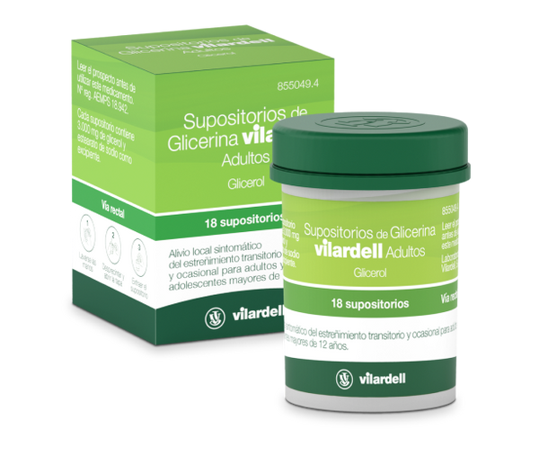 Medicamento con propiedades laxantes administrada por vía rectal.Supositorios Glicerina Vilardell Adultos 18 Supositorios este medicamento se trata de un poderoso laxante gracias a su principio activo: el glicerol. Viene en un formato de supositorio que introduciremos fácilmente por la vía rectal para conseguir que el glicerol ablande las heces y que acompañada de una leve irritación local se estimulen los movimientos del intestino, con el que se aliviarán los síntomas del estreñimiento transitorio tanto de adultos como de adolescentes.