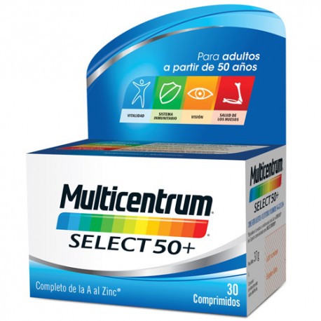Multicentrum Select 50+ 30 comprimidos es un complemento alimenticio, indicado para adultos mayores de 50 años, que aporta un extra de vitaminas y minerales necesarios para el correcto funcionamiento del metabolismo.
